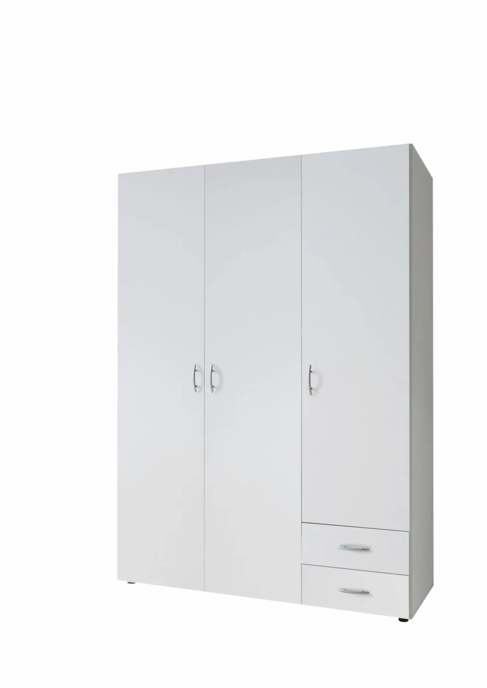 Répartition intérieure : derrière les 2 portes de gauche se trouvent 1 tablette et 1 barre de penderie ; derrière la porte de droite se trouvent 2 tablettes
