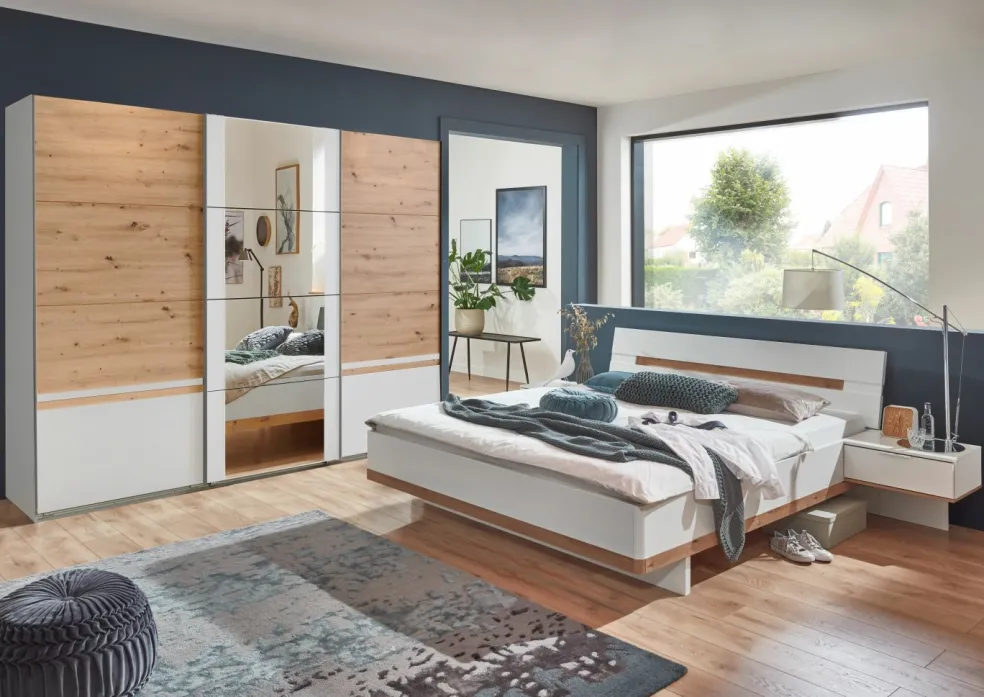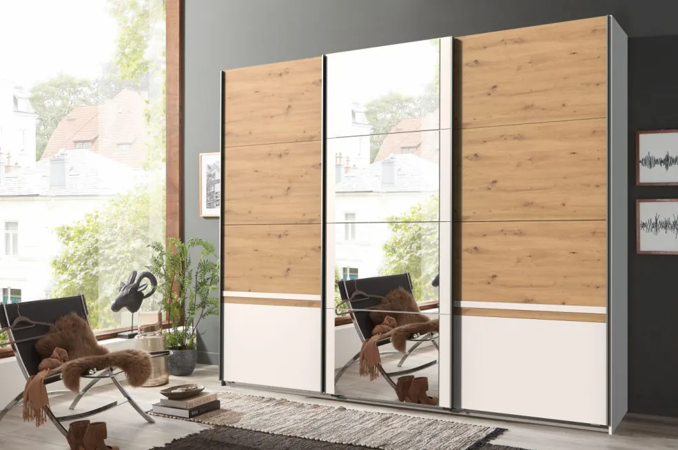 Caisson et façade : ton blanc avec contrastes décor chêne Artisan / miroir