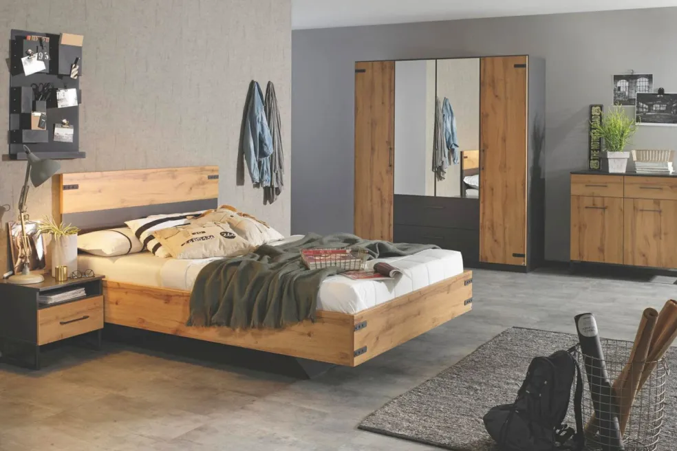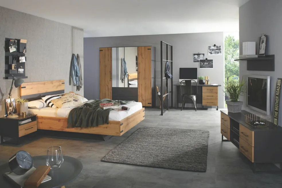 Façade: décor chêne Artisan avec façades des tiroirs ton gris métallisé / miroir