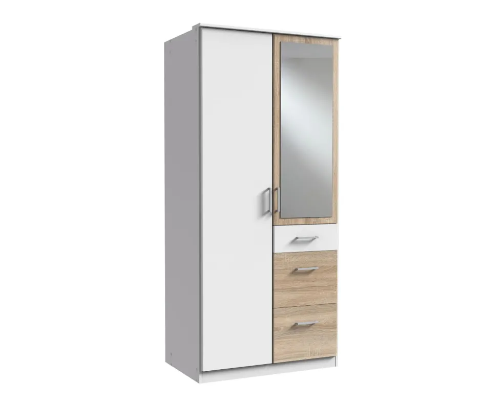 Façade et caisson: ton blanc aveccontrastesdécor chêne brut de sciage / miroir