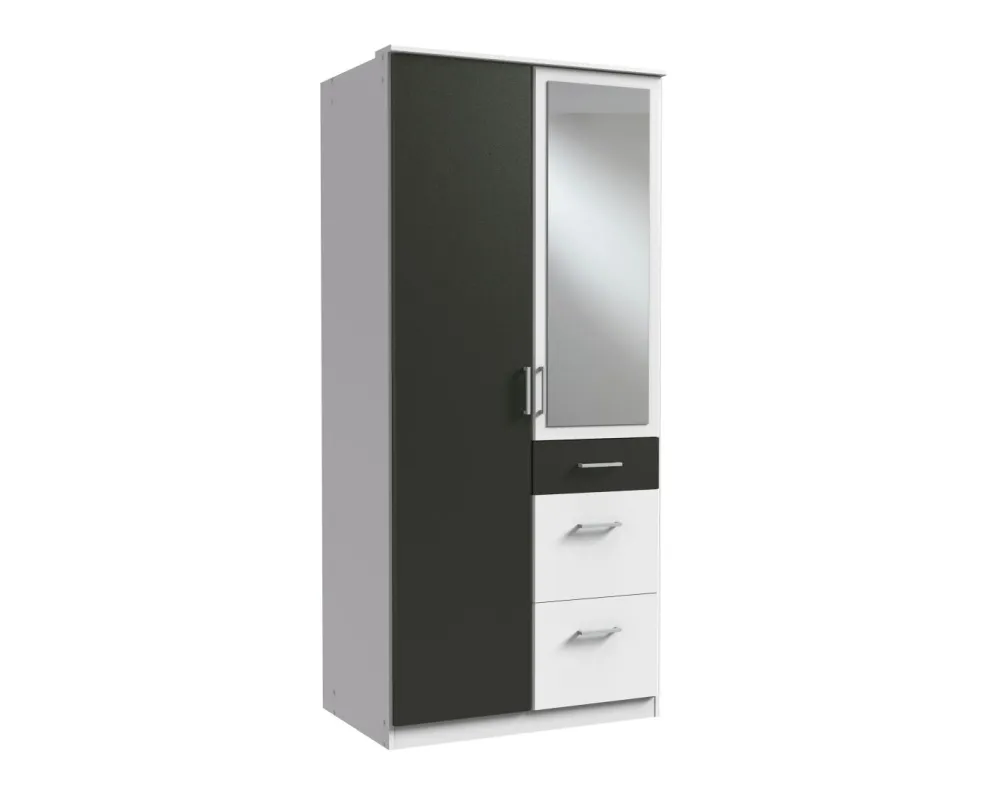 Façade et caisson: ton blanc avec portes extérieures et contrasteston graphite / miroir
