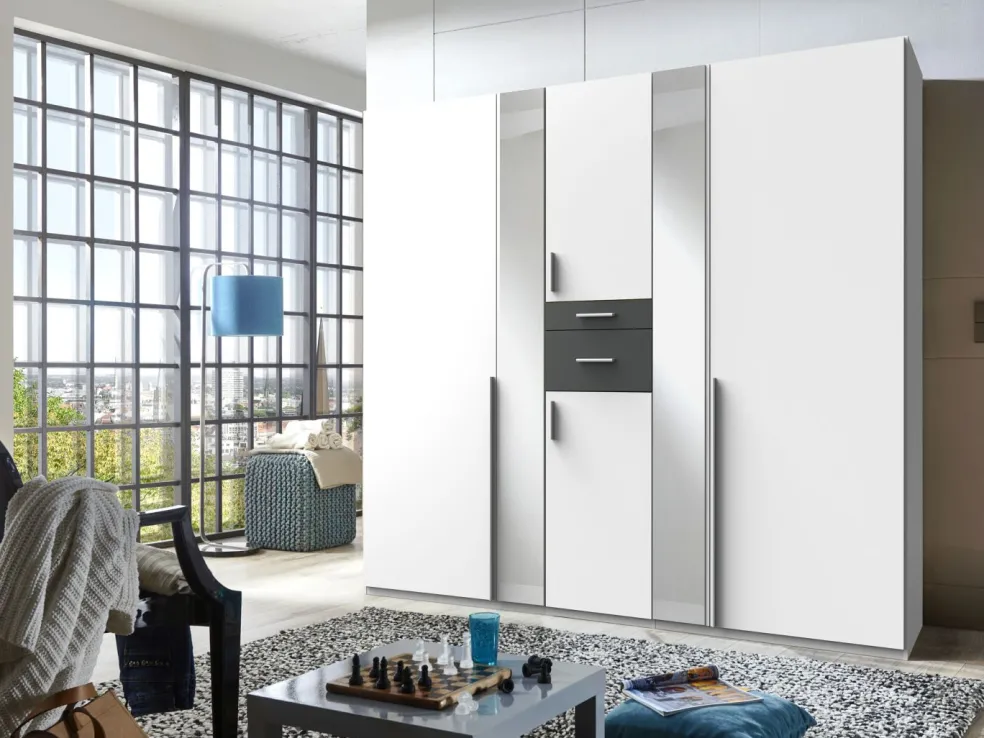 Façade: ton blanc avec tiroirs ton graphite/ miroir
