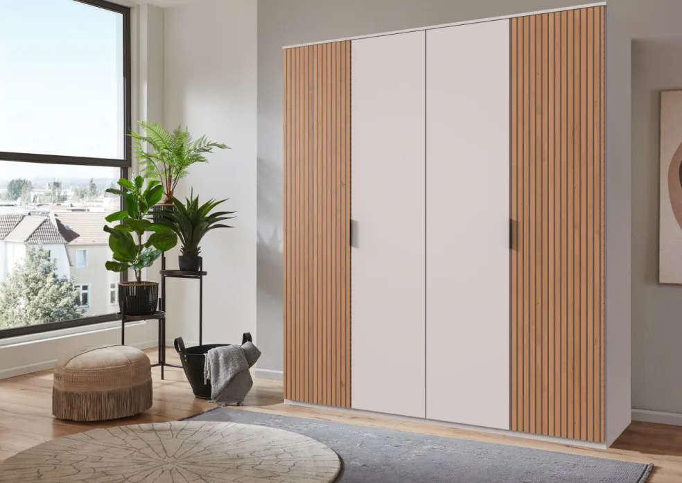 Façade: ton blanc avec contrastes aspect panneau acoustique à lamelles décor chêne Artisan