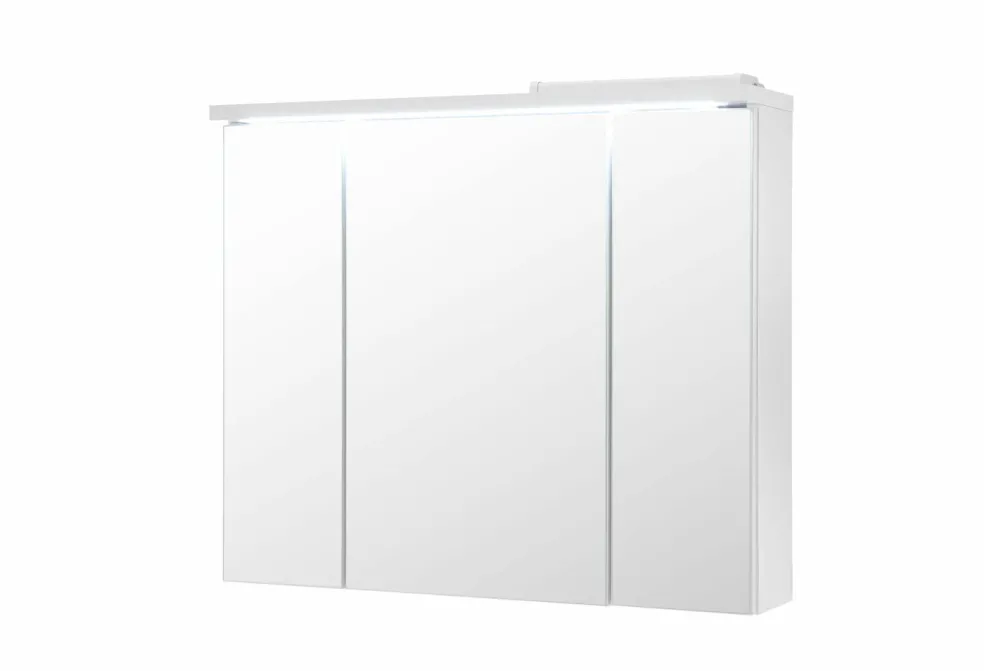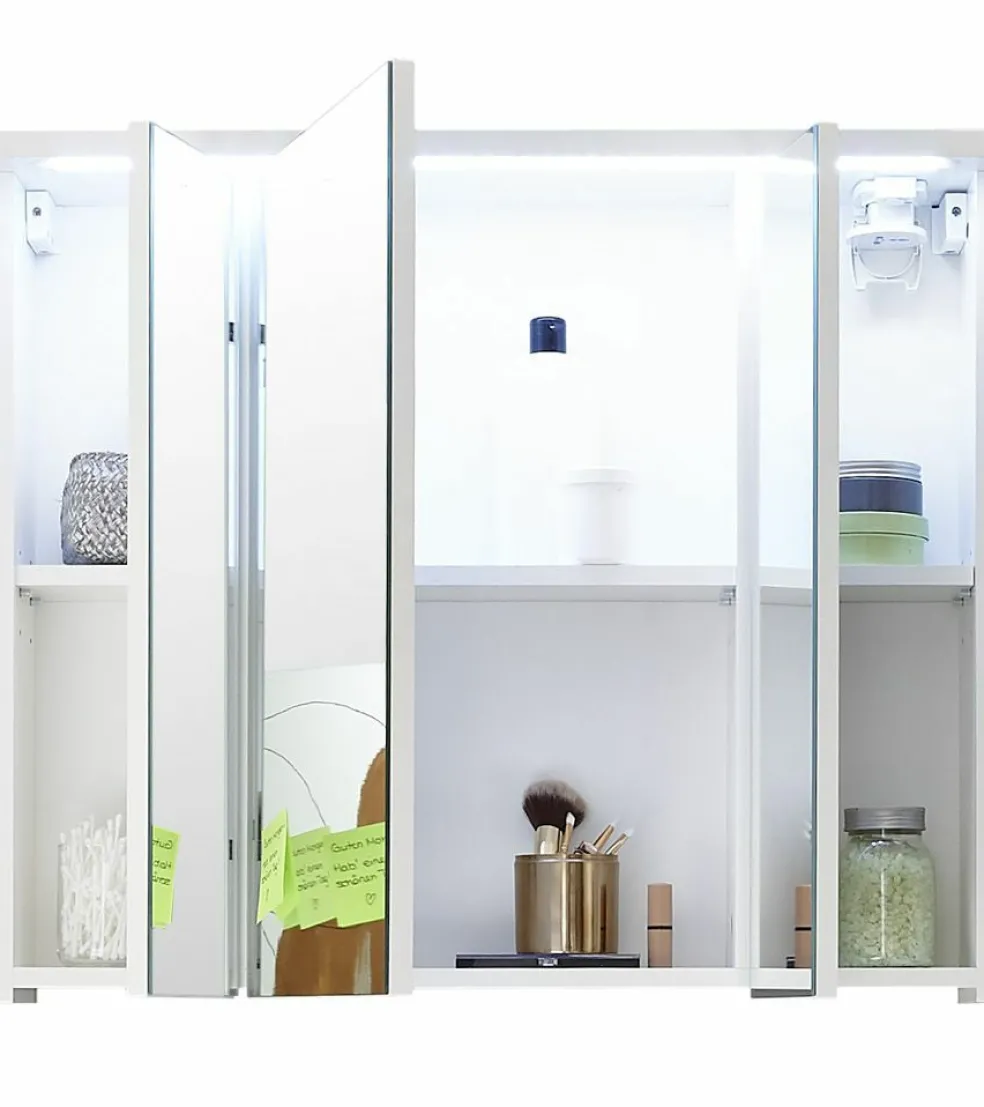 3 portes miroir avec, derrière chacune d’elles, 1 tablette