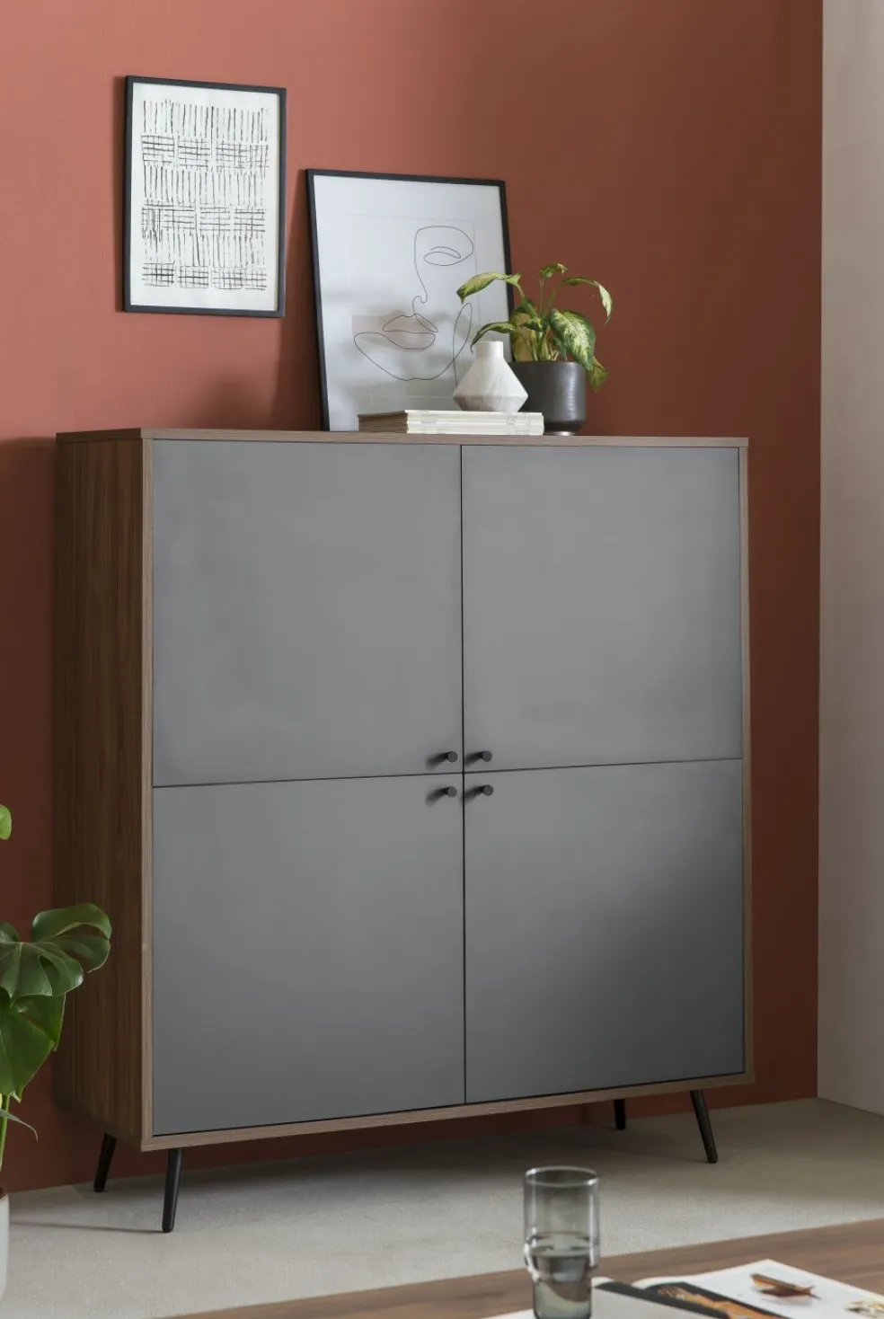 Caisson et façade : MDF ( panneaux de fibres de bois de moyenne densité) avec revêtement mélaminé ton noyer et gris