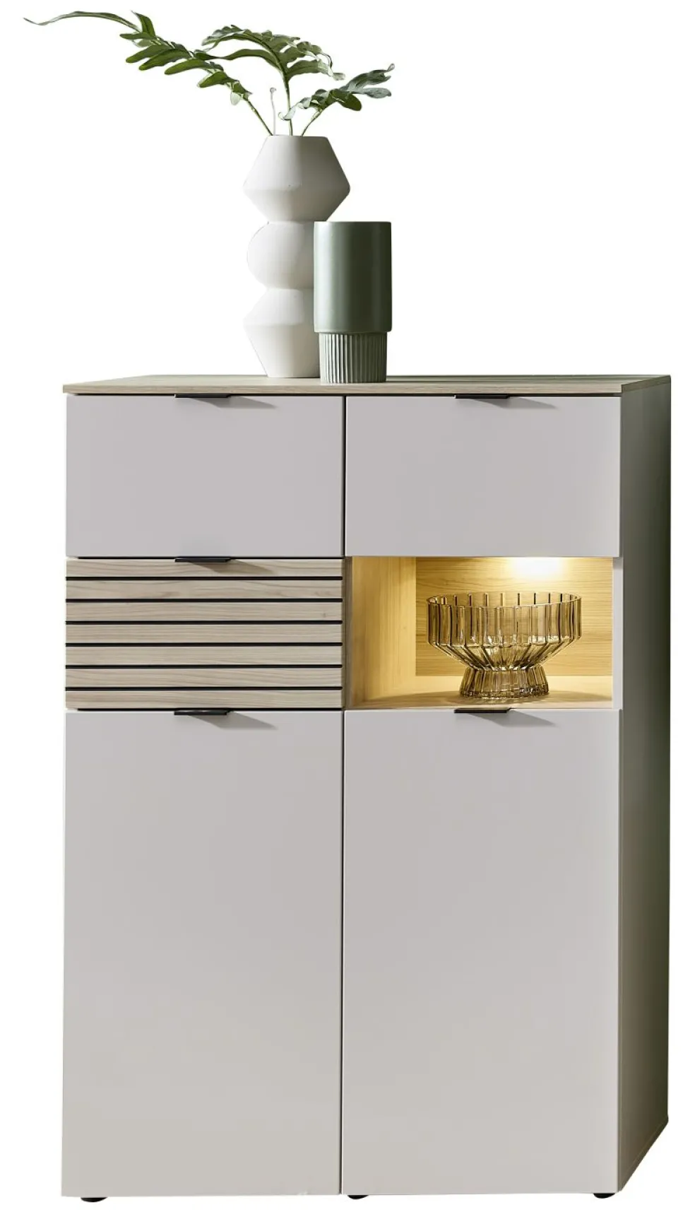 Façade: MDF (panneau de fibres de bois de densité moyenne) ton cachemire et contrastes MDF décor chêne Riva aspect lattes de bois / verre transparent