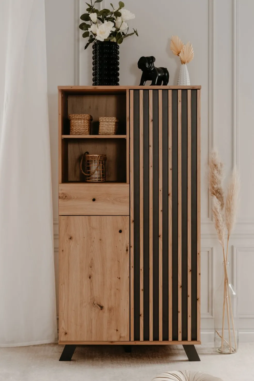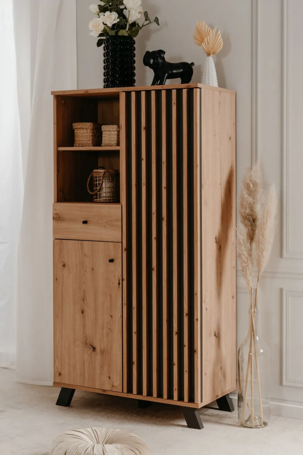 À droite : 1 porte avec des lamelles et, derrière elle, 3 tablettes amovibles