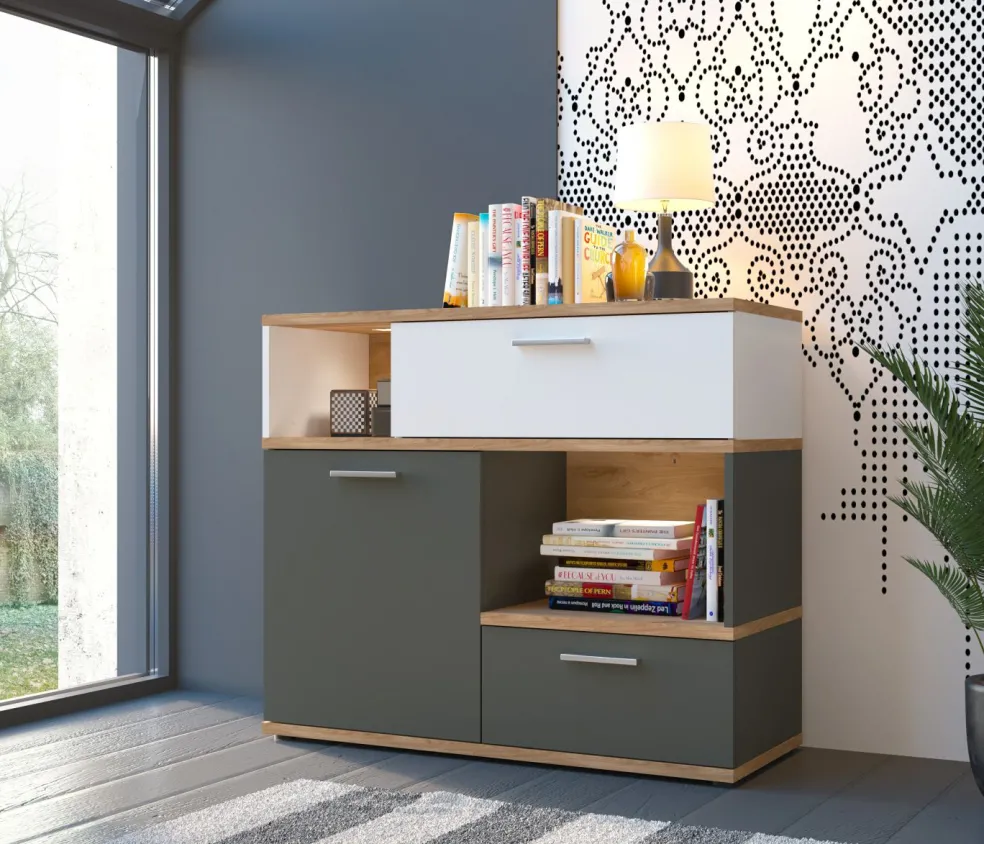 | Équipement Commodes Phono Bureau Étagère: | Casiers ouverts, Portes, Tiroirs | ||