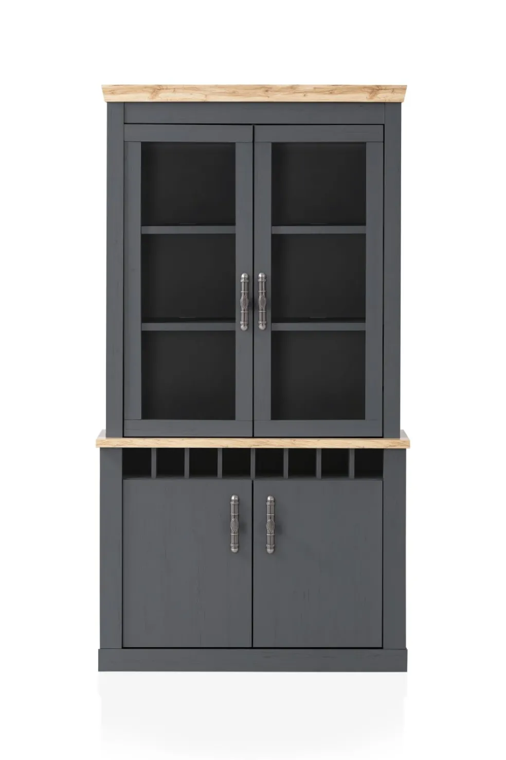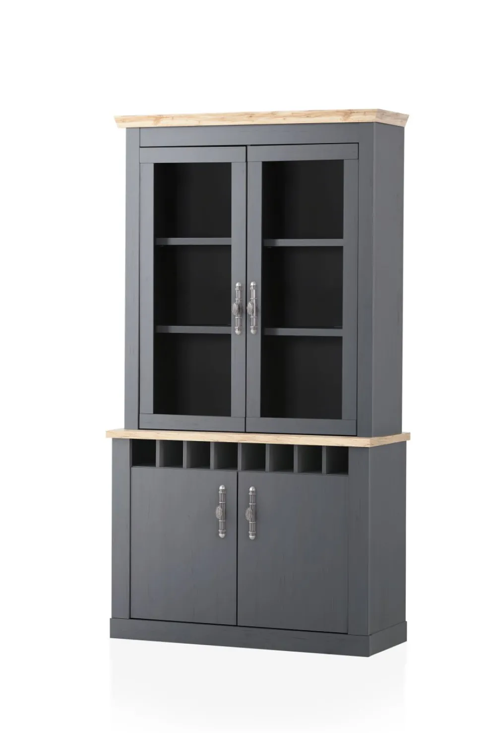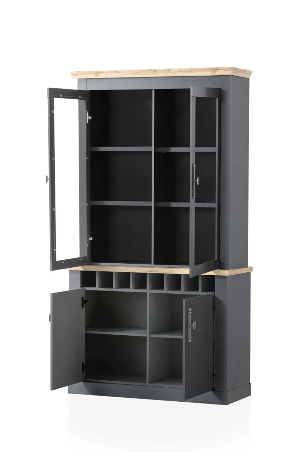 Partie supérieure avec 2 portes vitrées et, derrière chacune d’elles, 2 tablettes