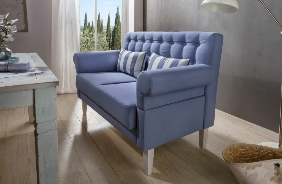 Revêtement : corps et assise en tissu Sylt 1532 ton bleu 80% polyester et 20% coton ; coussins décoratifs en tissu Sylt 1533 ton bleu/blanc à rayures 80% polyester et 20% coton