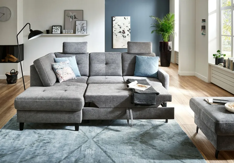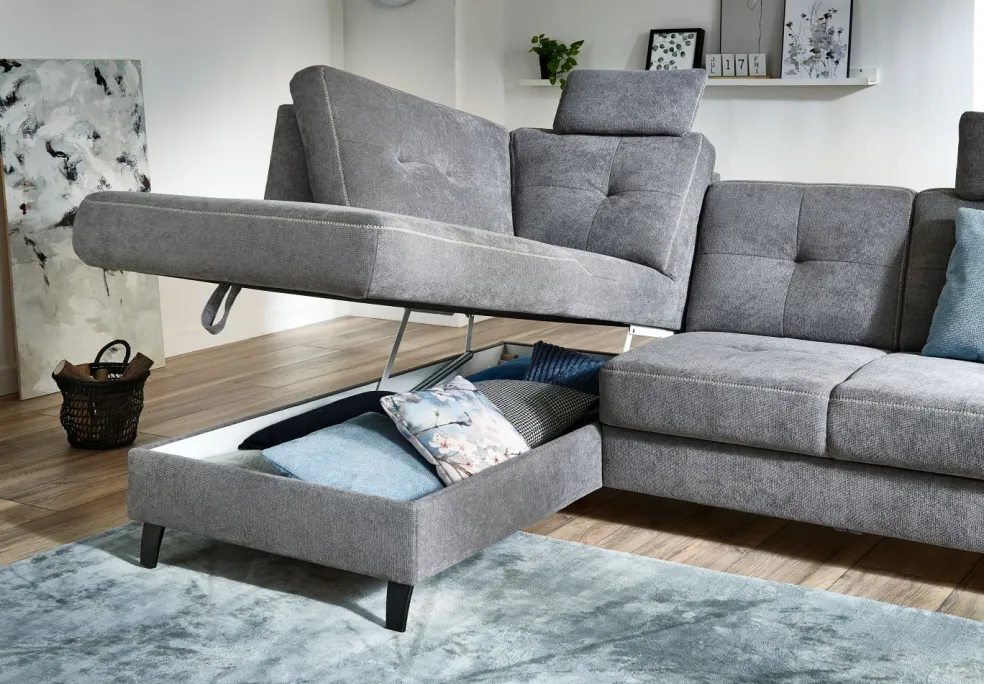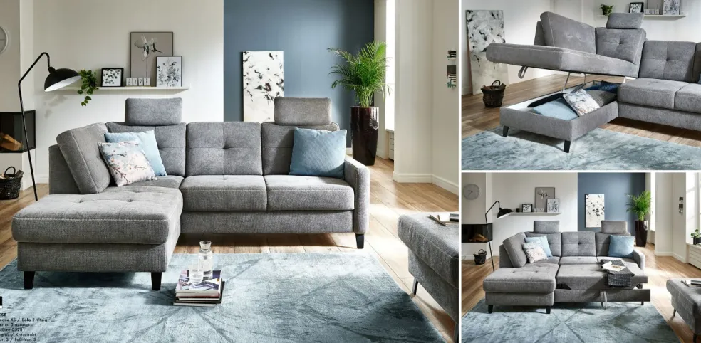| Equipement canapés: | Dos habillé, Méridienne à gauche, incl. coffre de lit | ||