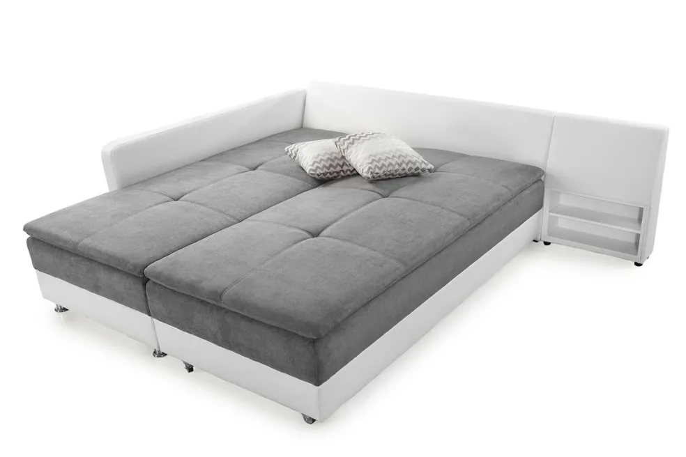 Canapé d’angle ultra tendance avec un garnissage de qualité et système boxspring. Ce canapé peut être utilisé tous les jours comme lit grâce à son garnissage avec suspension nosag et sa surface de couchage 7 zones avecressorts ensachés en forme de tonneaux. Il garantit un excellent confort d’assise et de couchage grâce à son surmatelas en mousse haute résilience intégré. En faisant pivoter la méridienne, on crée une surface de couchage plus importante. Un chevet pratique avec deux casiers est intégré dans le dossier.