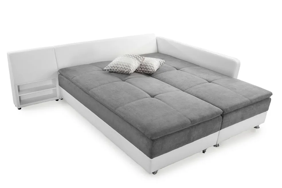 Canapé d’angle ultra tendance avec un garnissage de qualité et système boxspring. Ce canapé peut être utilisé tous les jours comme lit grâce à son garnissage avec suspension nosag et sa surface de couchage 7 zones avecressorts ensachés en forme de tonneaux. Il garantit un excellent confort d’assise et de couchage grâce à son surmatelas en mousse haute résilience intégré. En faisant pivoter la méridienne, on crée une surface de couchage plus importante. Un chevet pratique avec deux casiers est intégré dans le dossier.