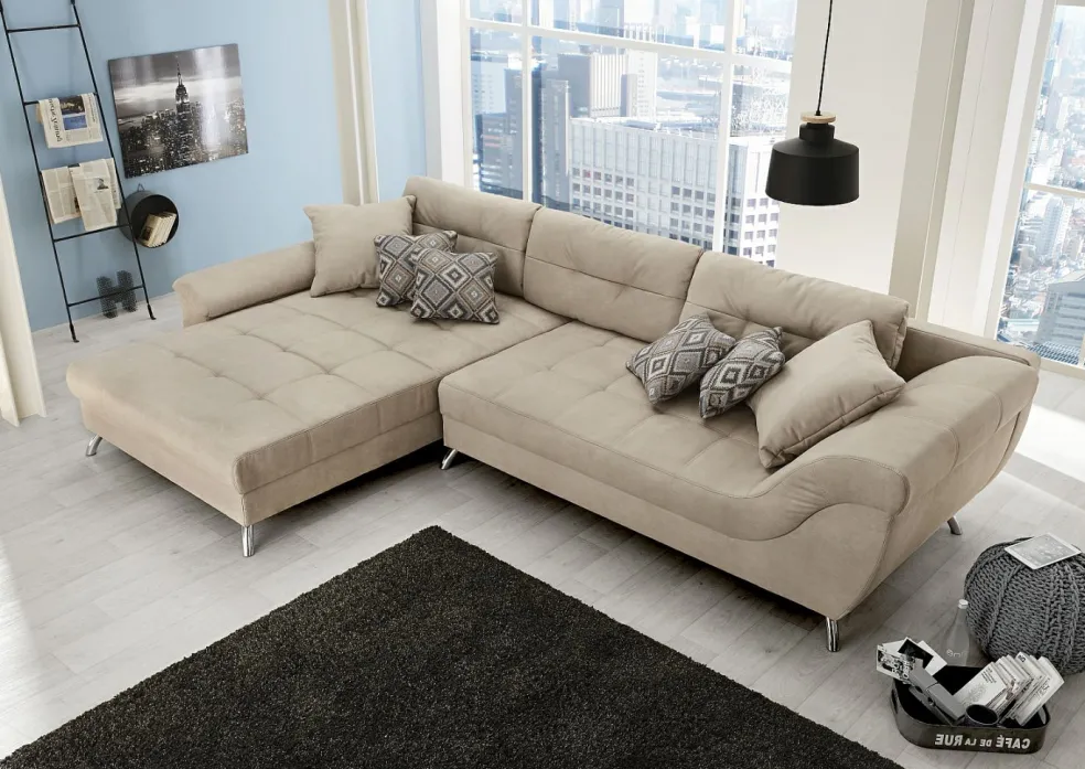 Canapé d’angle ultra tendance aspect nubuck avec une surpiqûre attrayante dans l’assise. Le garnissage de qualité avec suspension nosag, mousse polyéther et couche de mousse haute résilience intégrée garantit un excellent confort d’assise. Grâce à son dos habillé, ce canapé peut être positionné librement dans la pièce.
