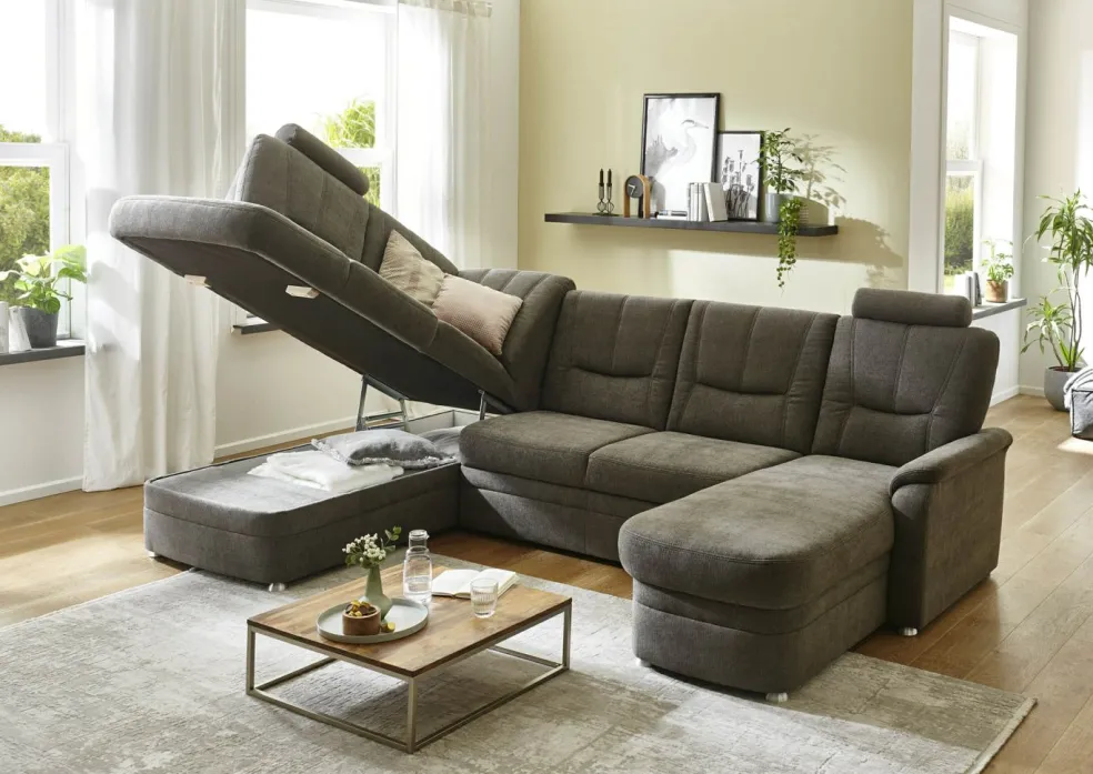 | Equipement canapés: | Dos habillé, Méridienne à droite, incl. coffre de lit | ||