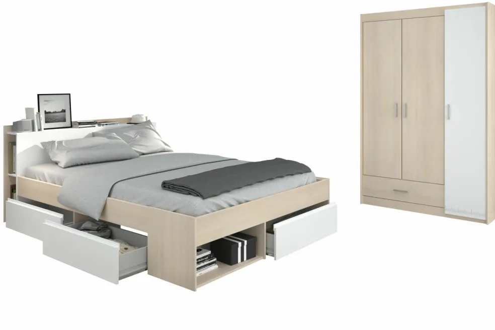 1 tête de lit avec tablette et, de chaque côté, 2 casiers