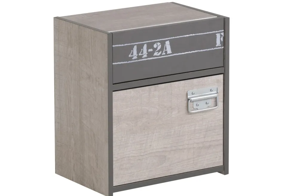 Voici un chevet cool et tendance dans un style industriel avec des possibilités de rangement pratiques dans un tiroir et derrière une porte. Le motif imprimé attirera tous les regards.