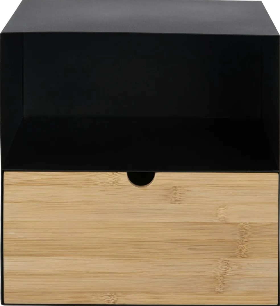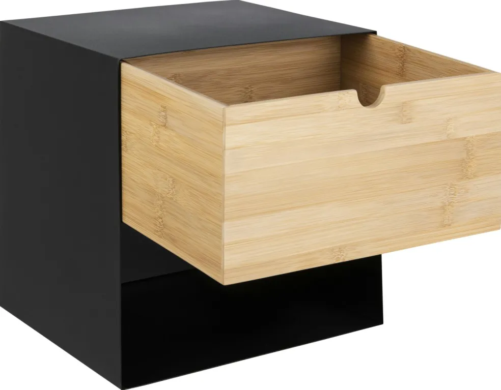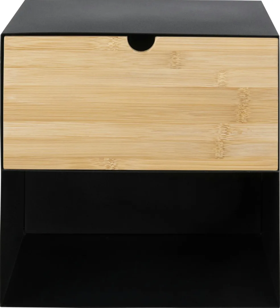 Caisson et façade : métal finition époxy aspect rugueux ton noir mat et un tiroir en bambou massif (Chine) avec couche de laque NC