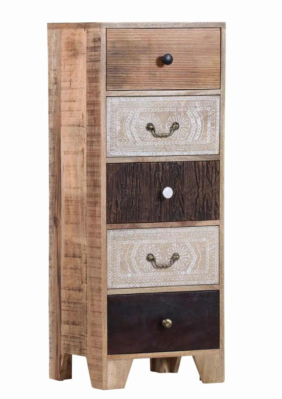Façades : acacia massif (Inde), acacia massif avec gravures, MDF avec résine aspect bois vieilli
