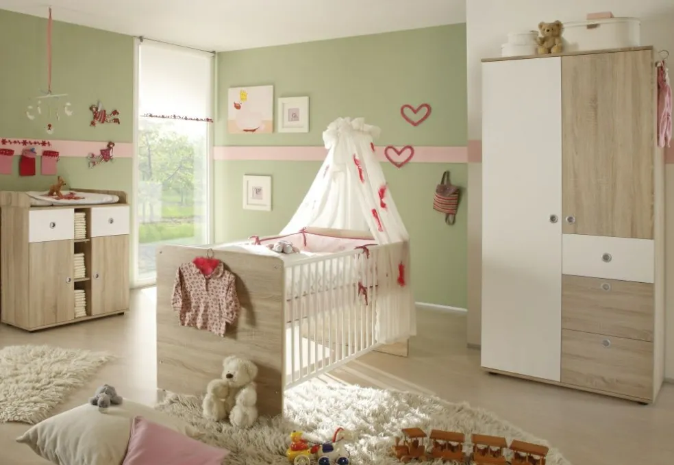 La commodeà langer WIKI dispose de deux portes avec, derrière chacune d’elles, une tablette amovible, deux tiroirs et trois casiers ouverts très pratiques.
