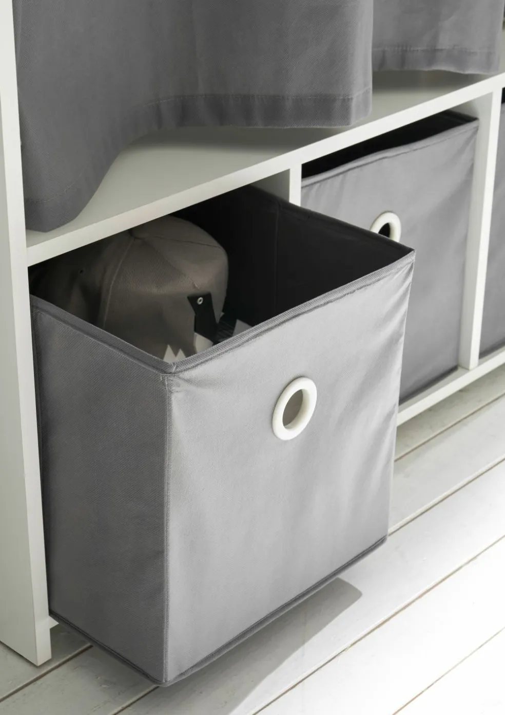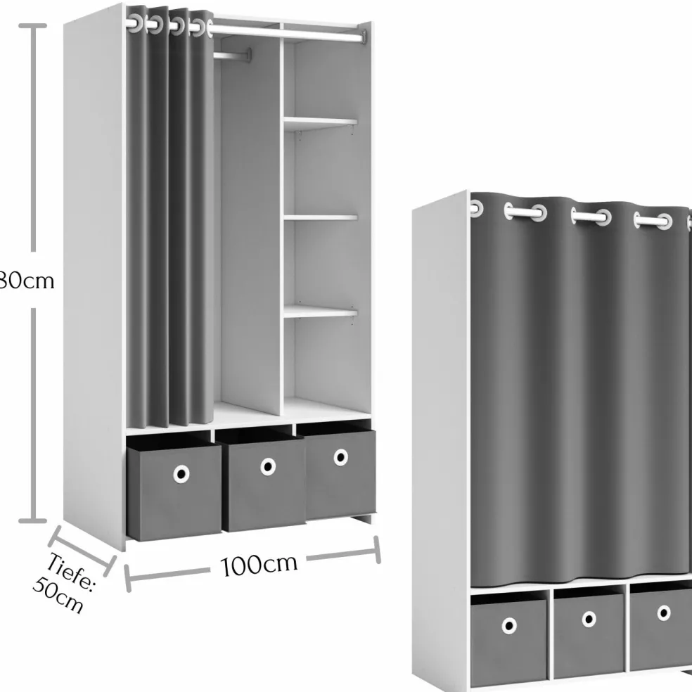 Répartition intérieure : 1 paroi médiane ; à gauche : 1 barre de penderie, à droite : 3 tablettes, en bas: 3 casiers avec boîtes de rangement