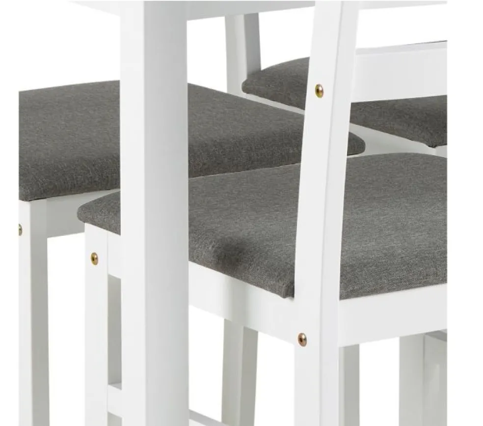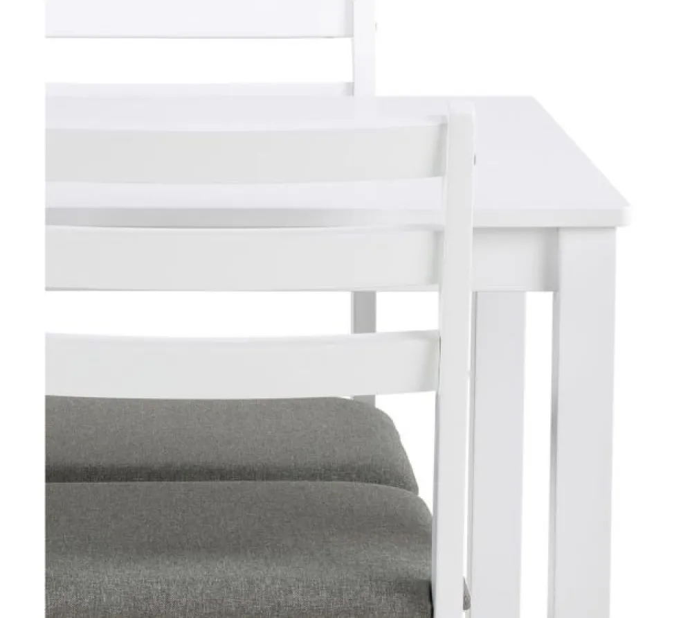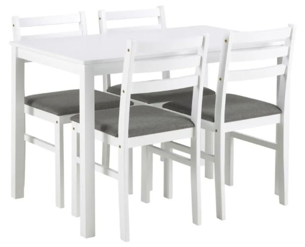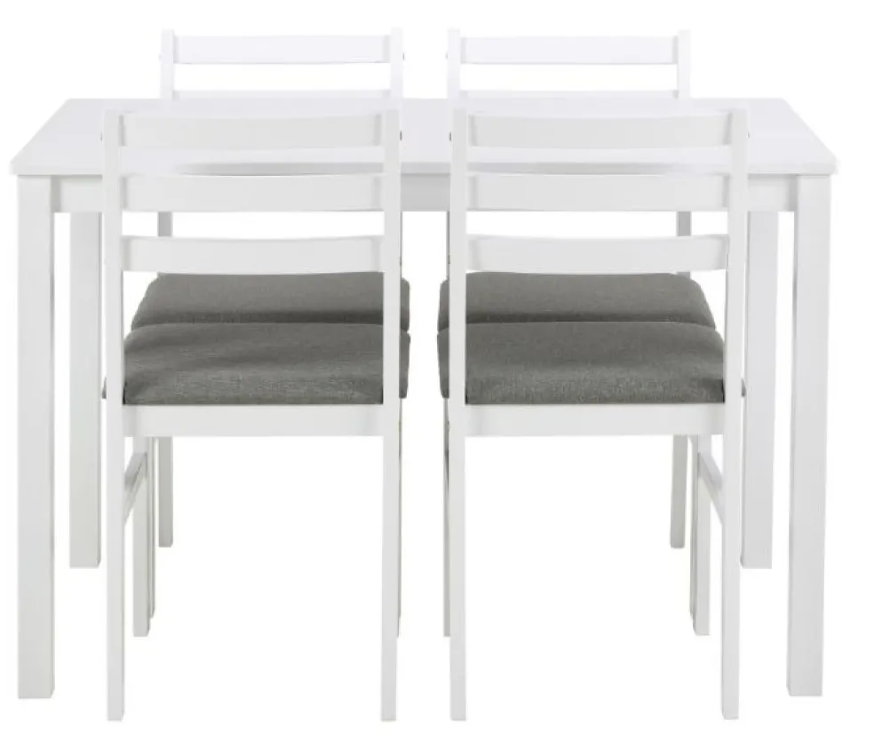 Il comprend une table de repas rectangulaires et 4 chaises assorties. Les chaises sont pourvues d’une assise rembourrée ton gris clair.