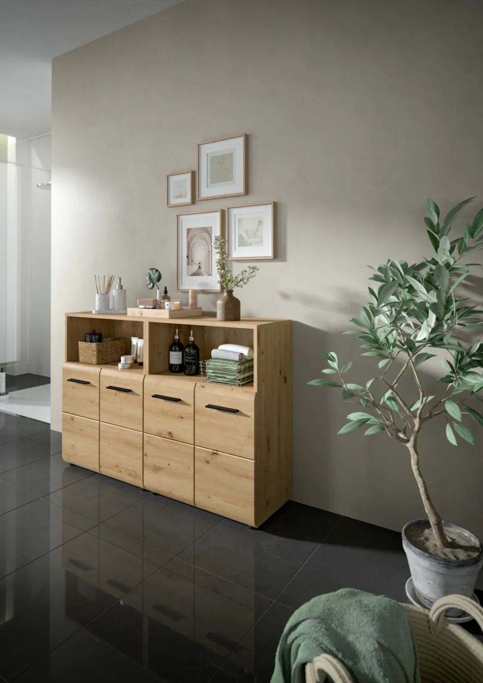 2 meubles de salle de bains avec, chacun, 1 casier ouvert, 2 portes et 1 tablette amovible