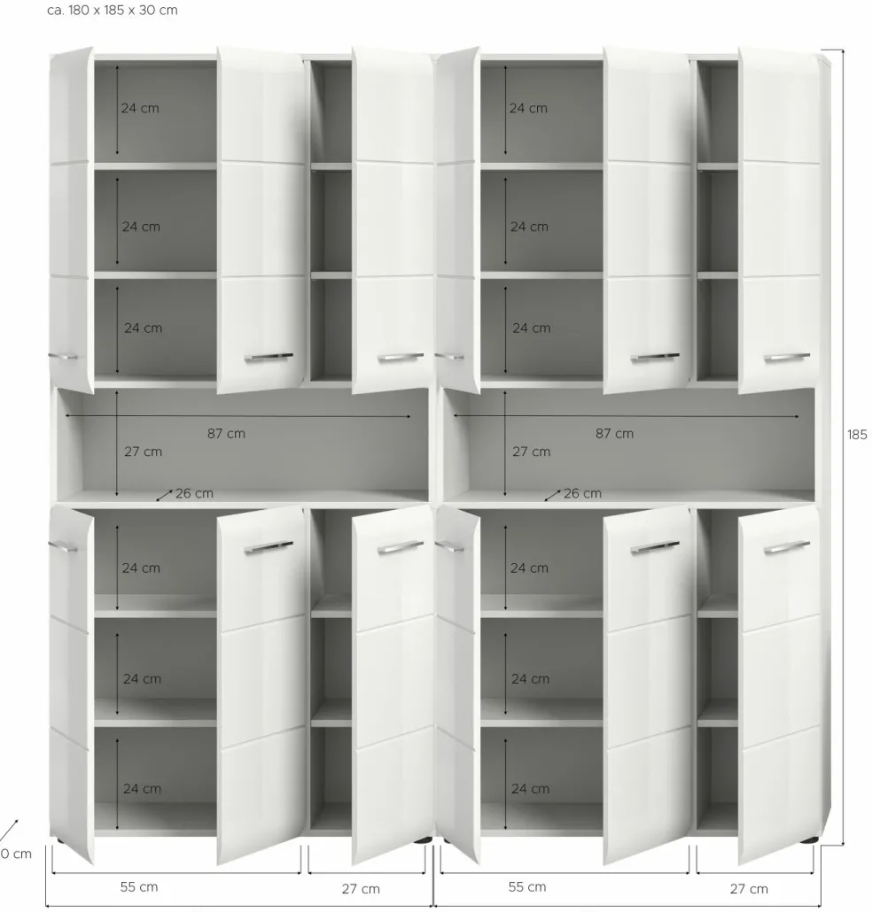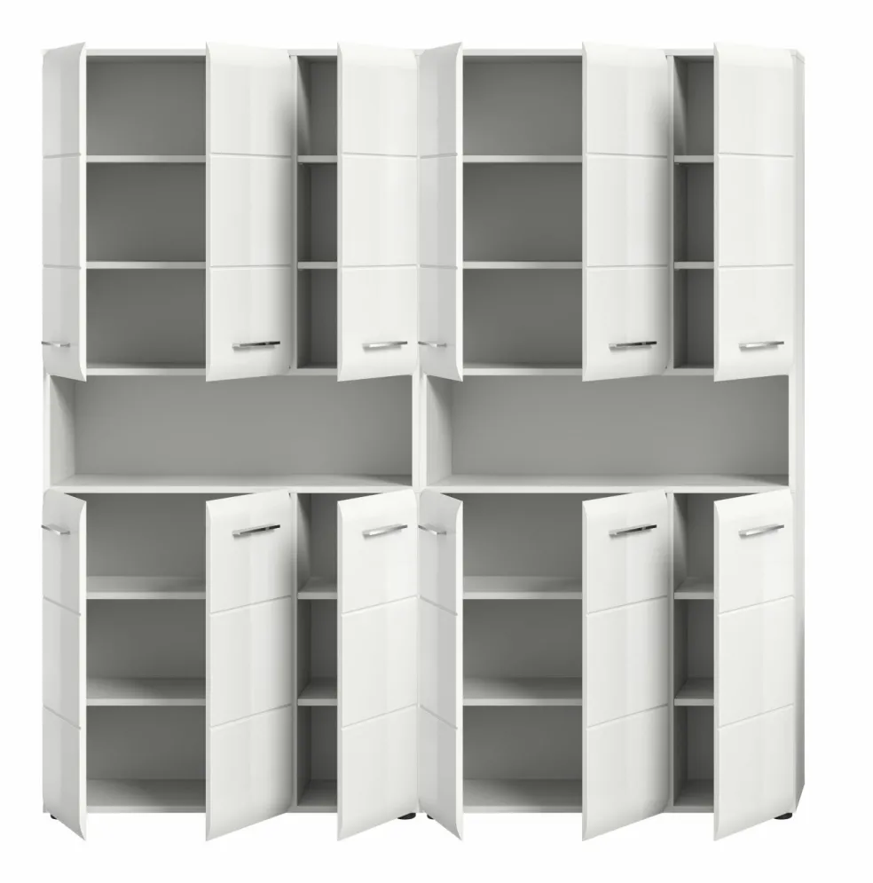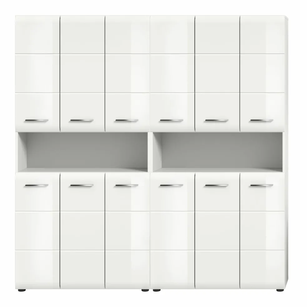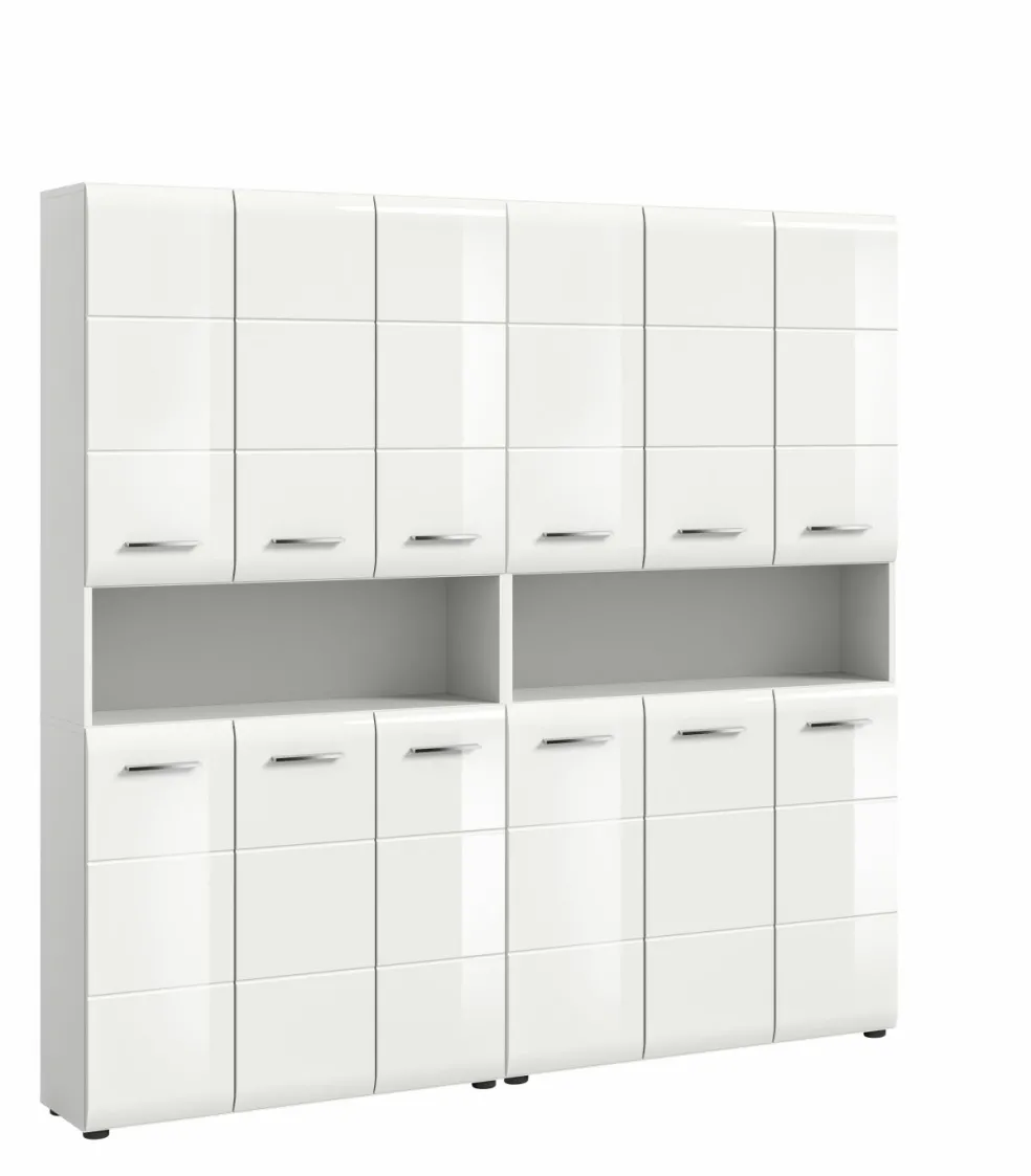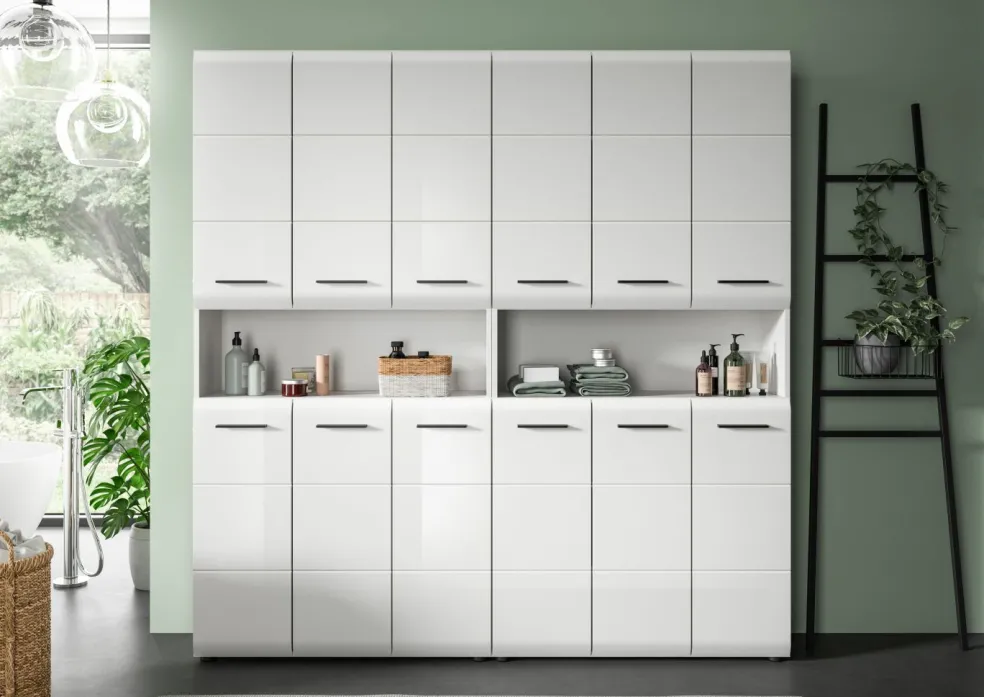 2 armoires de salle de bains avec, chacune, 6 portes, 8 tablettes amovibles et 1 casier ouvert