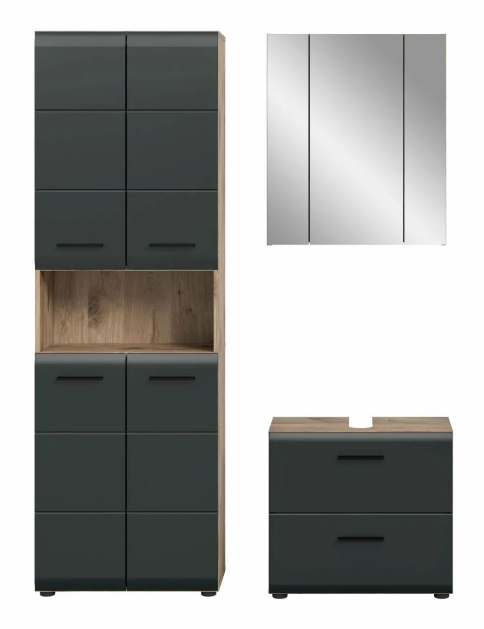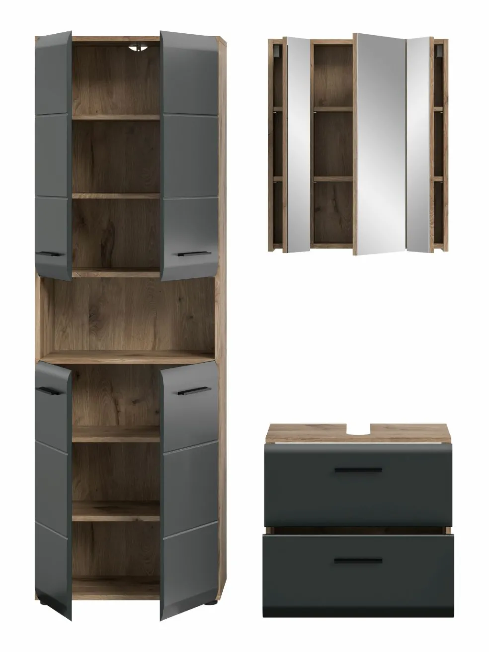 1 armoire de salle de bains avec 4 portes, 3 tablettes amovibles et 1 casier ouvert