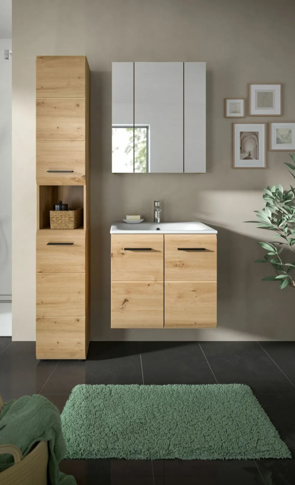 1 colonne de salle de bains avec 2 portes, 4 tablettes amovibles et 1 casier ouvert