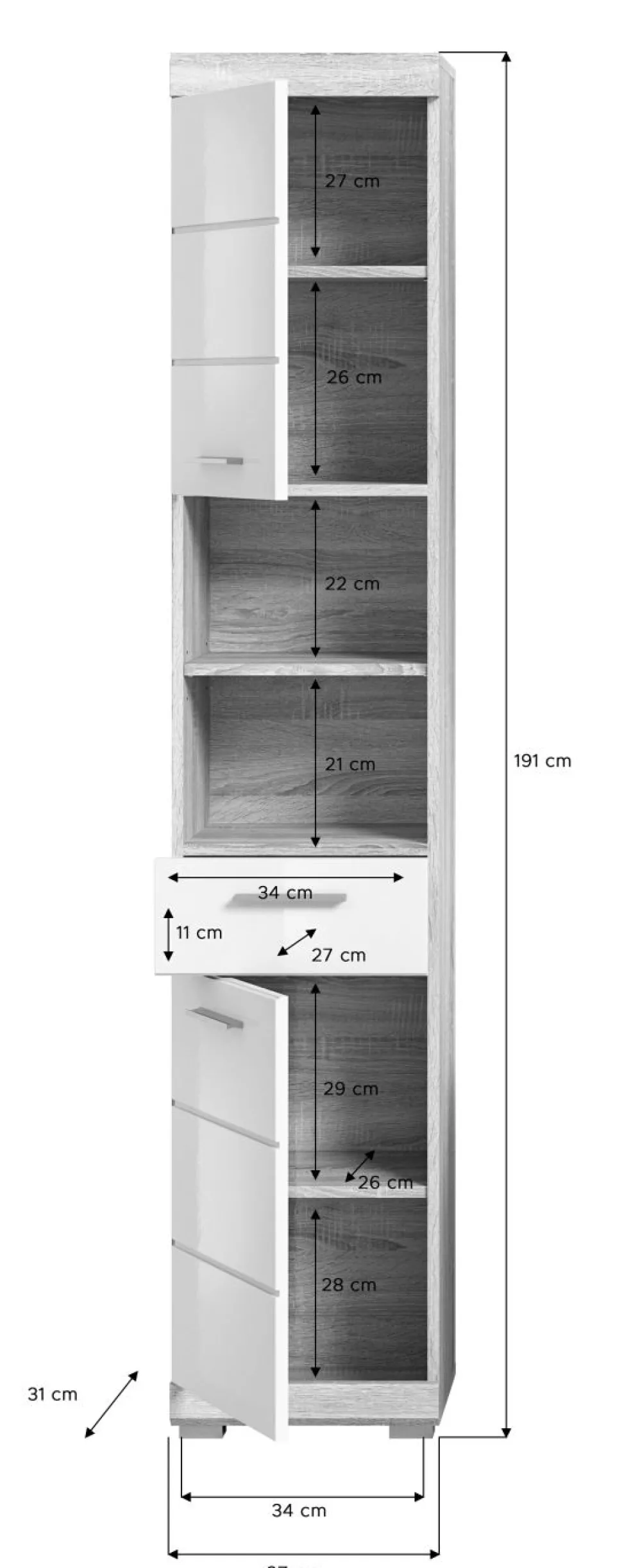 1 colonne de salle de bains avec 2 portes, 2 tablettes amovibles, 2 tablettes fixes, 2 casiers ouverts et 1 tiroir