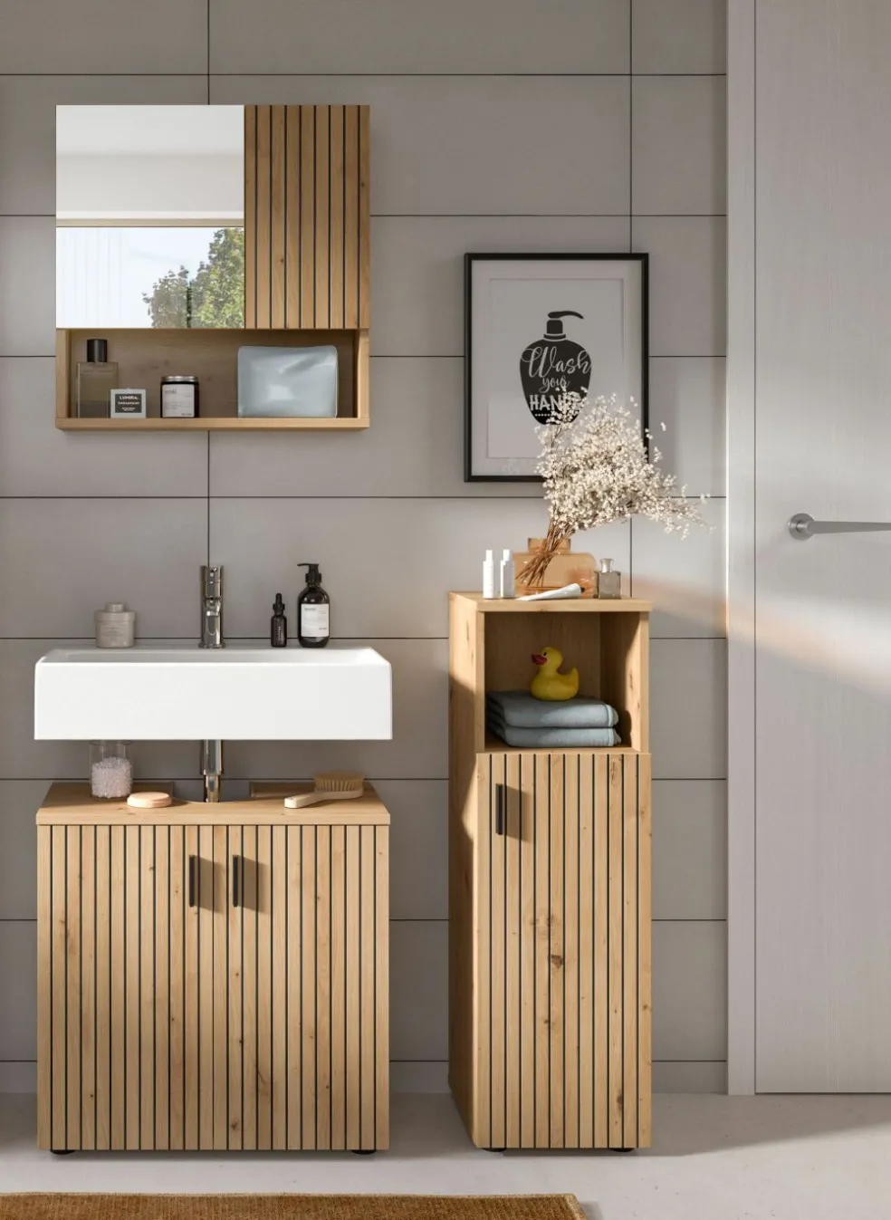 1 meuble de salle de bains avec 1 porte, 1 tablette amovible et 1 casier ouvert