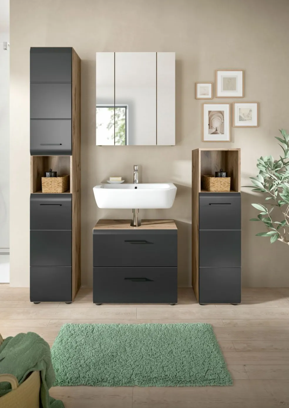 1 colonne de salle de bains avec 2 portes, 4 tablettes amovibles et 1 casier ouvert