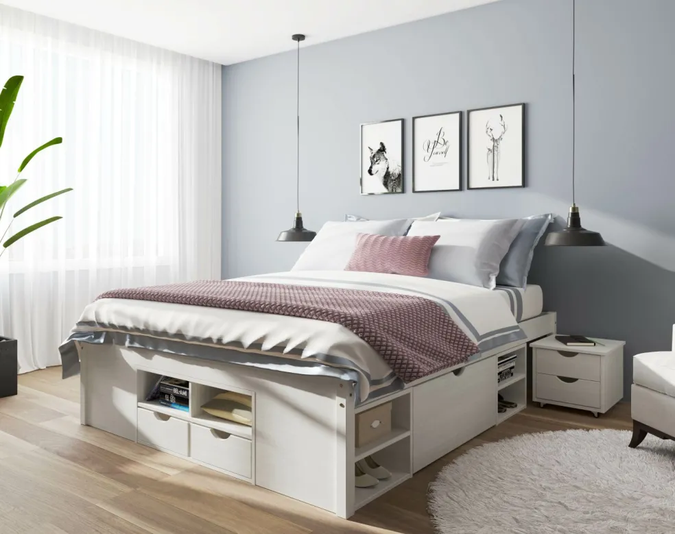 - Lit bien pensé avec un système de rangement ultra pratique : quatre tiroirs, douze casiers et deux chevets à roulettes pouvant se ranger sous le lit