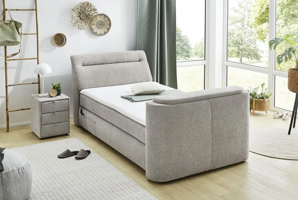 La structure de ce lit boxspring est composée d’un coffre de lit avec garnissage à ressorts bonnell. Sur ce caisson se trouve un matelas à ressorts bonnell. La double suspension ainsi formée crée un confort unique avec une adaptation optimale à la morphologie du dormeur et une réduction de la pression. Le surmatelas en mousse polyuréthane apporte la touche finale à ce lit boxspring. Ce lit boxspring garantit un confort de sommeil extraordinaire grâce à son excellentsystème individuel de suspension double. Le coffre de lit aéré intégré peut être ouvert facilement à l’aide d’un vérin à gaz et offre ainsi un bel espace de rangement