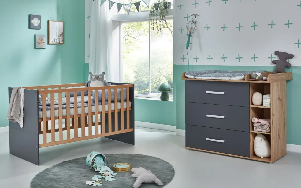 1 commode à langer avec plan à langer amovible, 3 tiroirs et 3 casiers ouverts
