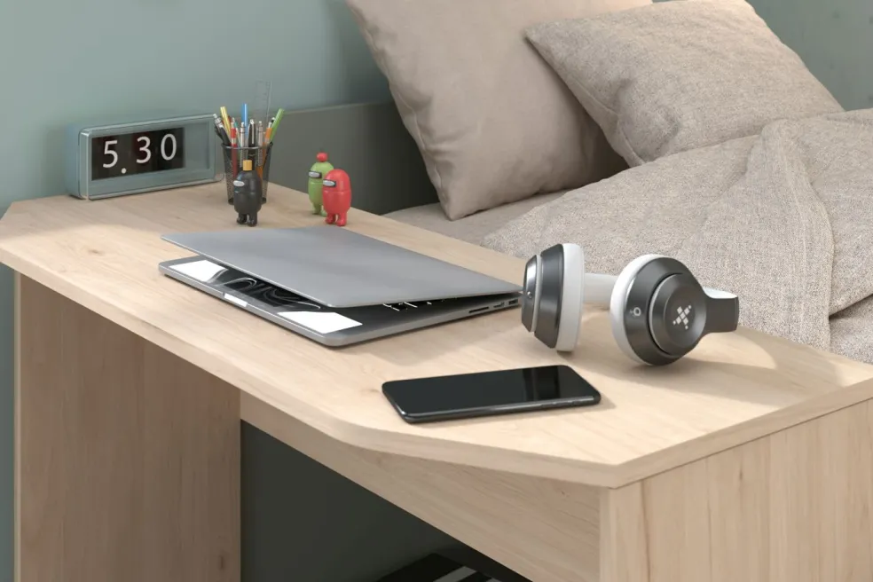 Le long de la surface de couchage: bureau intégré à hauteur de la tête de lit, bahut intégré avec 2 portes, 1 casier ouvert et 1 marche