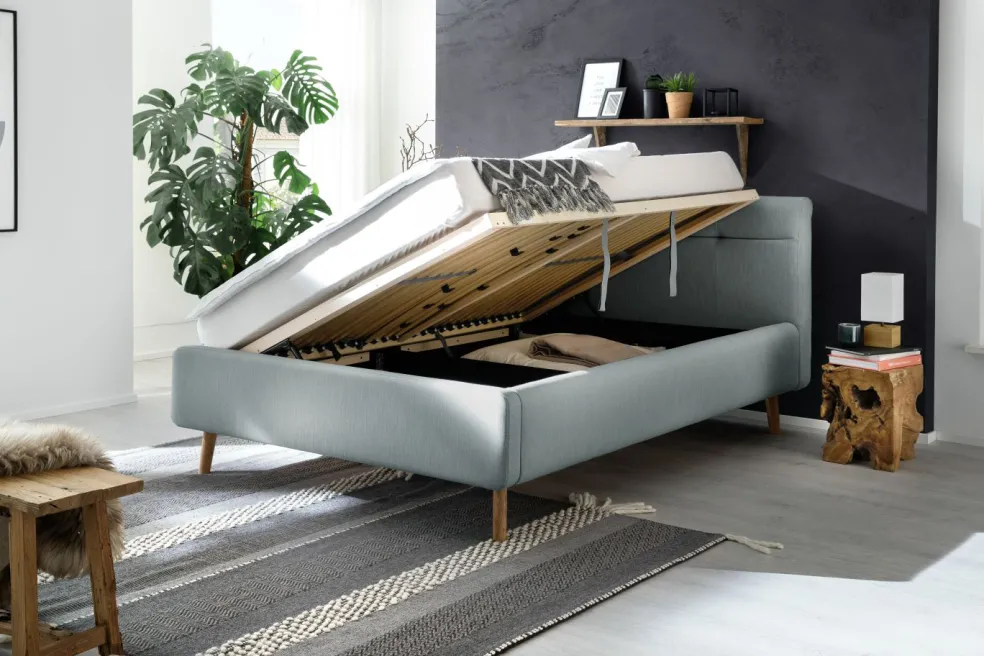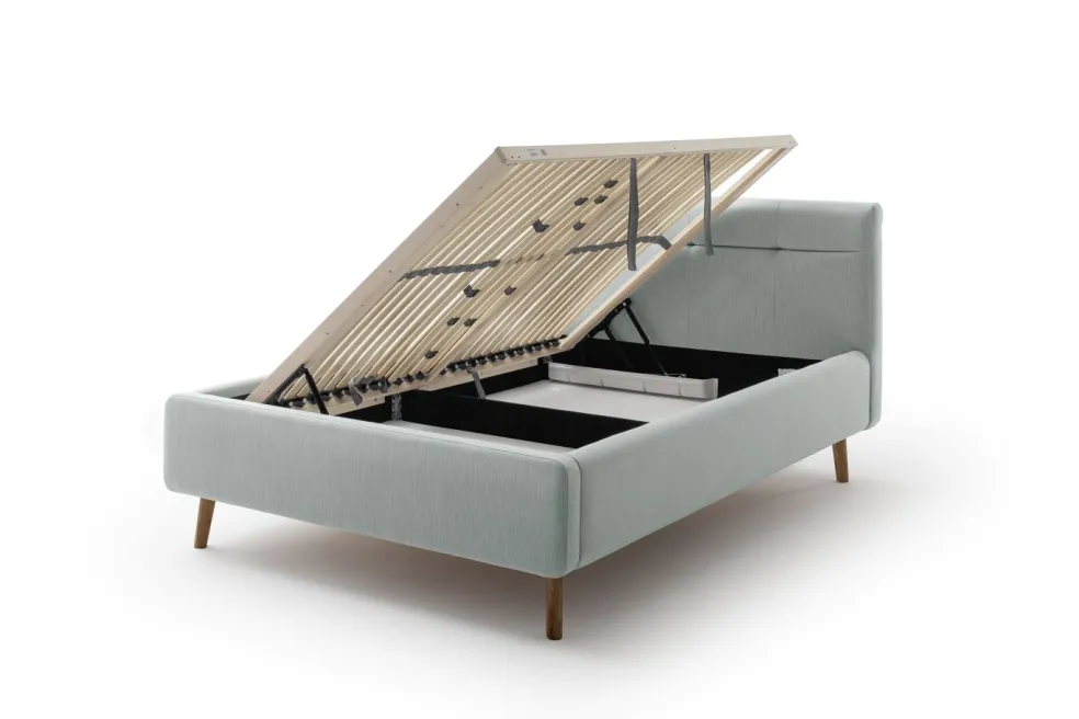 Inclus: coffre de lit avec aération et sommiers à lattes en bois multiplis avec ouverture latérale