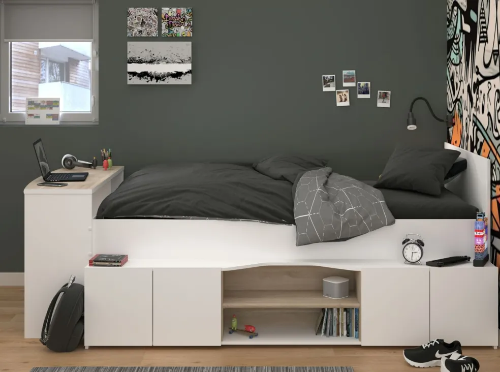Bureau intégré au pied du lit avec casier de rangement ouvert (pouvant être monté des deux côtés)