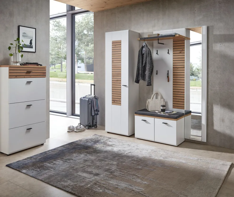 Façade: MDF (panneau de fibres de bois de densité moyenne) ton blanc mat et contrastes MDF décor chêne Artisan aspect lattes de bois
