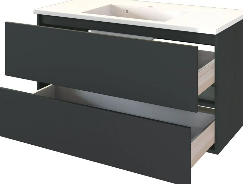 1 meuble sous vasque avec 2 tiroirs hauts sur rails métalliques, fermeture amortie et barre