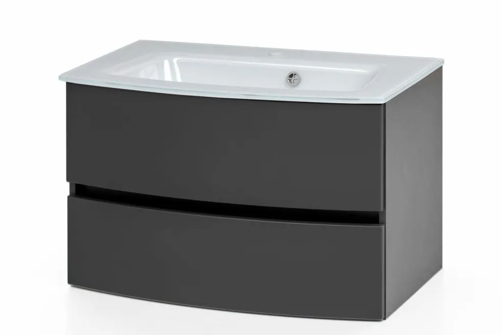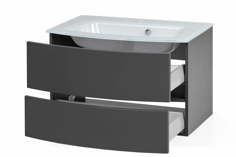 1 meuble sous vasque avec 2 tiroirs en métal à sortie totale avec fermeture amortie, façades arrondies
