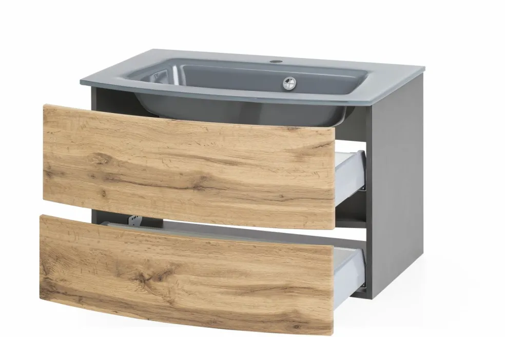 1 meuble sous vasque avec 2 tiroirs en métal à sortie totale avec fermeture amortie, façades arrondies