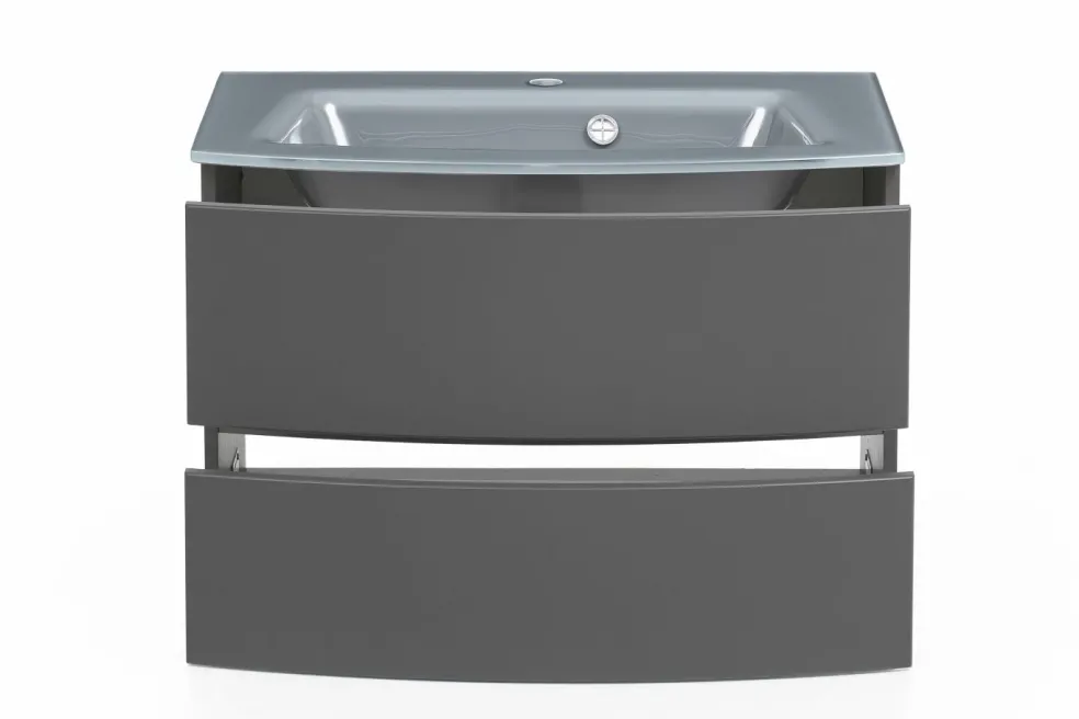 1 meuble sous vasque avec 2 tiroirs en métal à sortie totale avec fermeture amortie, façades arrondies