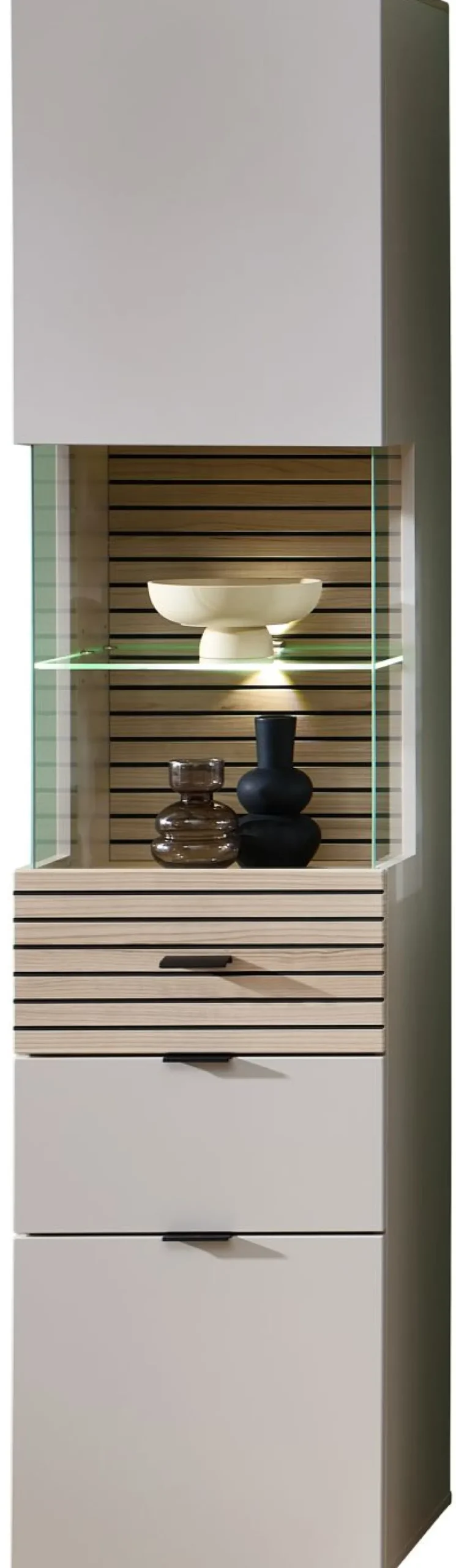 Façade: MDF (panneau de fibres de bois de densité moyenne) ton cachemire et contrastes MDF décor chêne Riva aspect lattes de bois / verre transparent