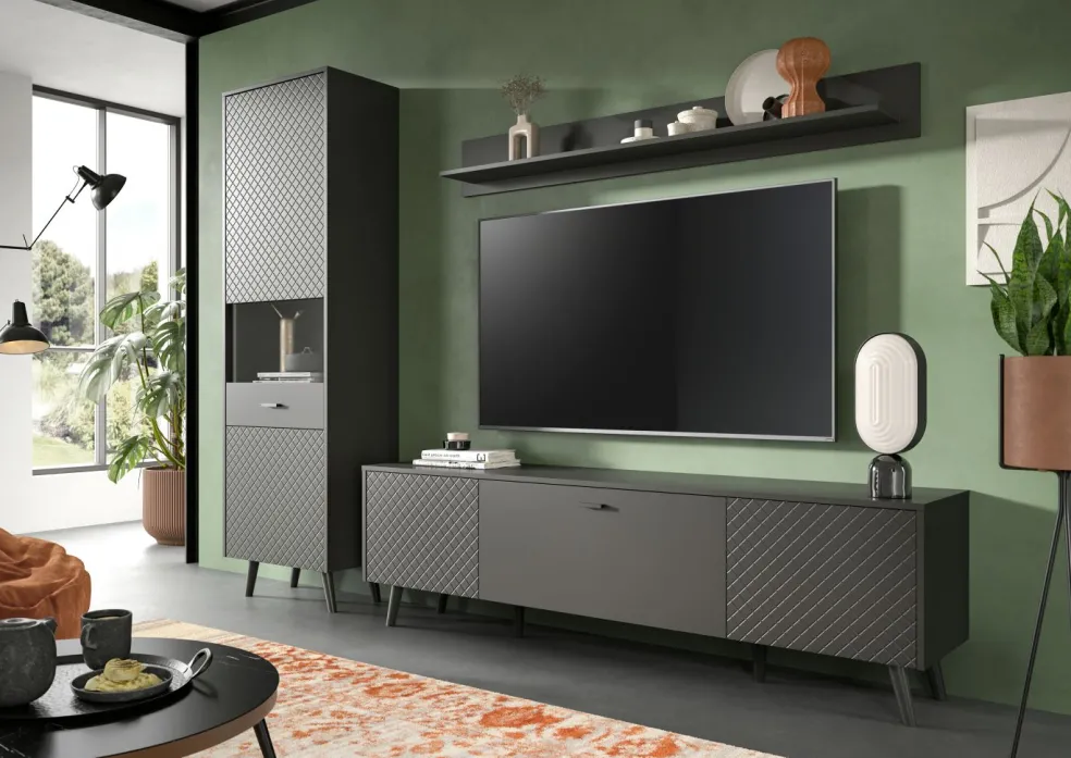 Façade: MDF ton gris mat (panneaux de fibres de bois de moyenne densité) thermoformé / verre