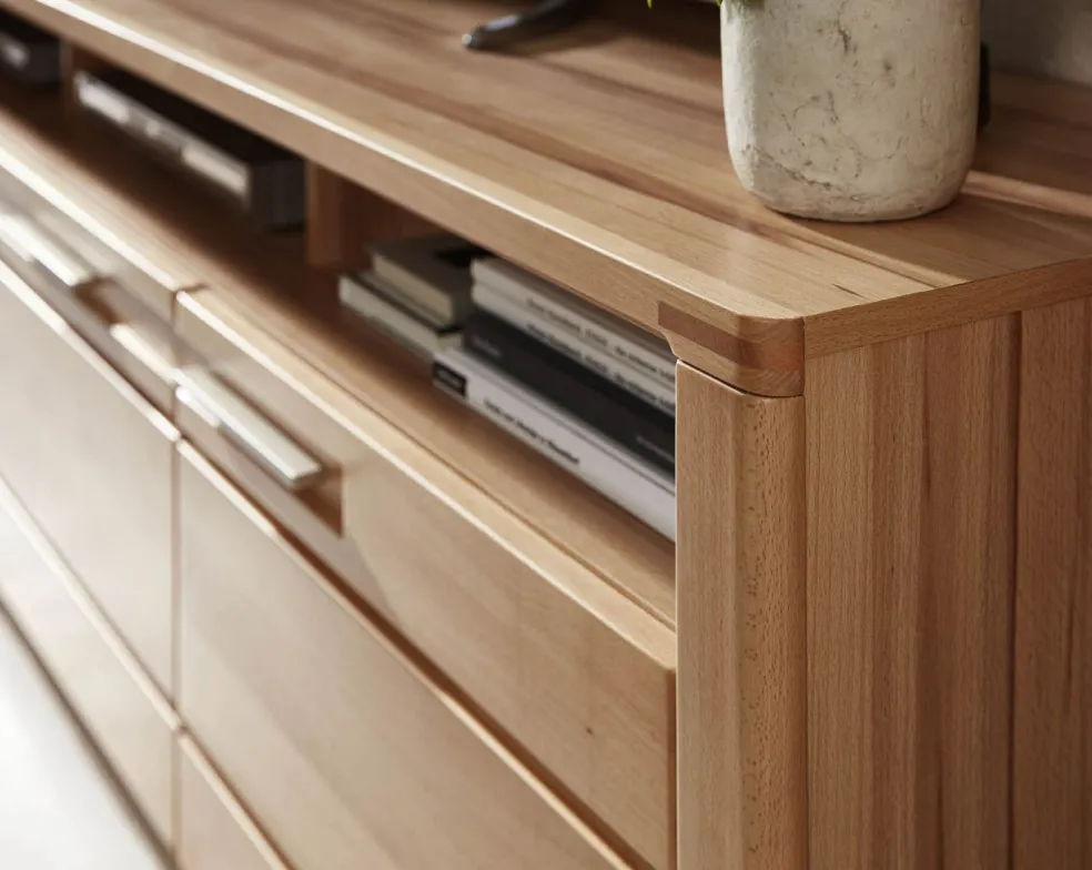 1 banc TV avec 3 casiers ouverts, 3 passe-câbles et 3 portes