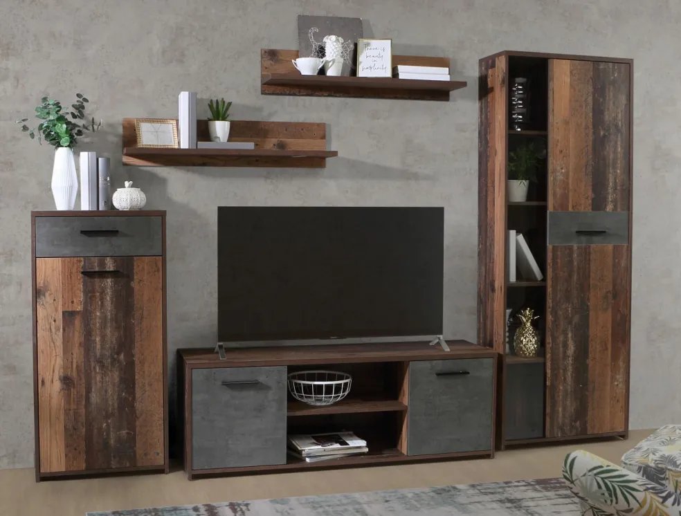 1 meuble TV avec 2 tiroirs, 2 casiers ouverts et 1 passe-câbles