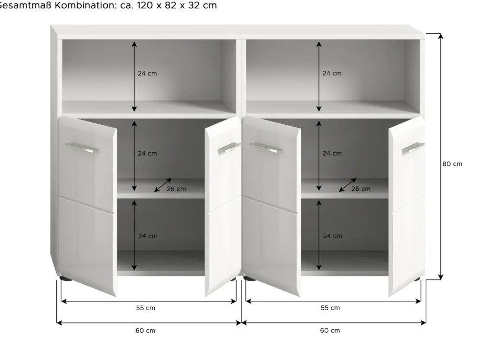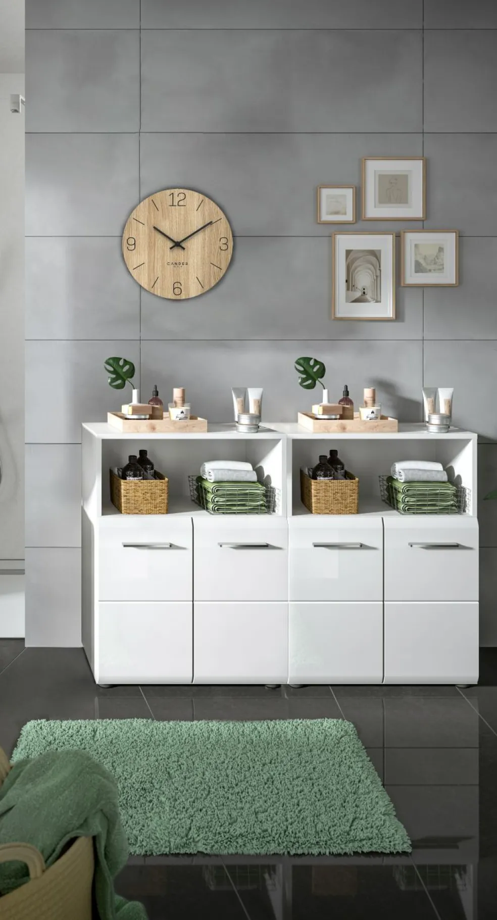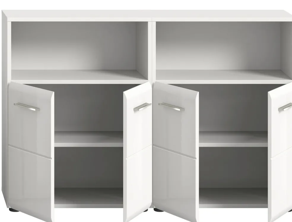 2 meubles de salle de bains avec 1 casier ouvert, 2 portes et 1 tablette amovible chacun