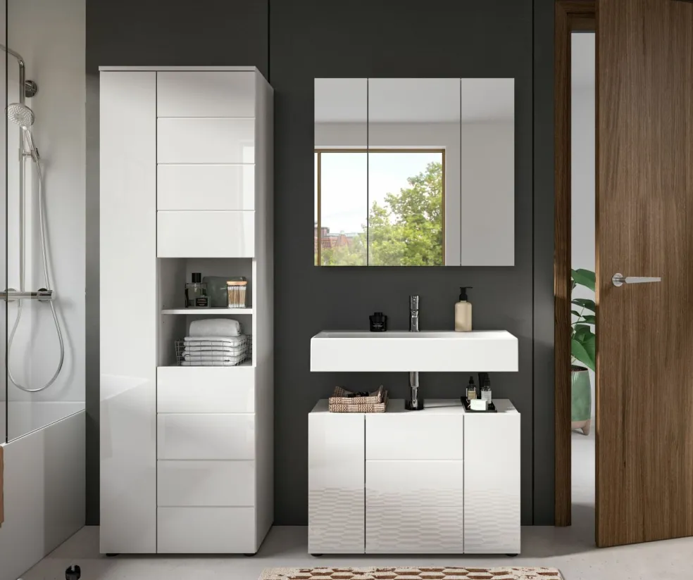 1 armoire de salle de bains avec 3 portes, 6 tablettes amovibles et 2 casiers ouverts